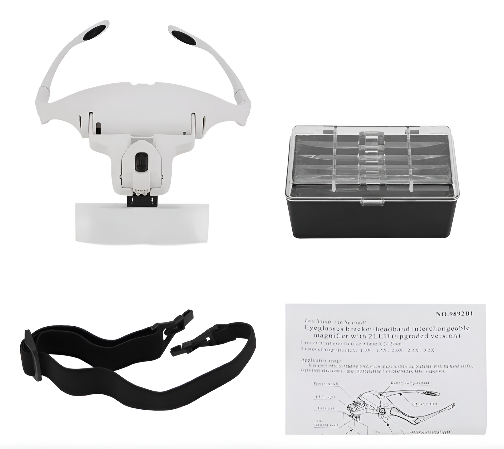 – 5 lentes de aumento desmontables: 1.0X, 1.5X, 2.0X, 2.5X, 3.5X